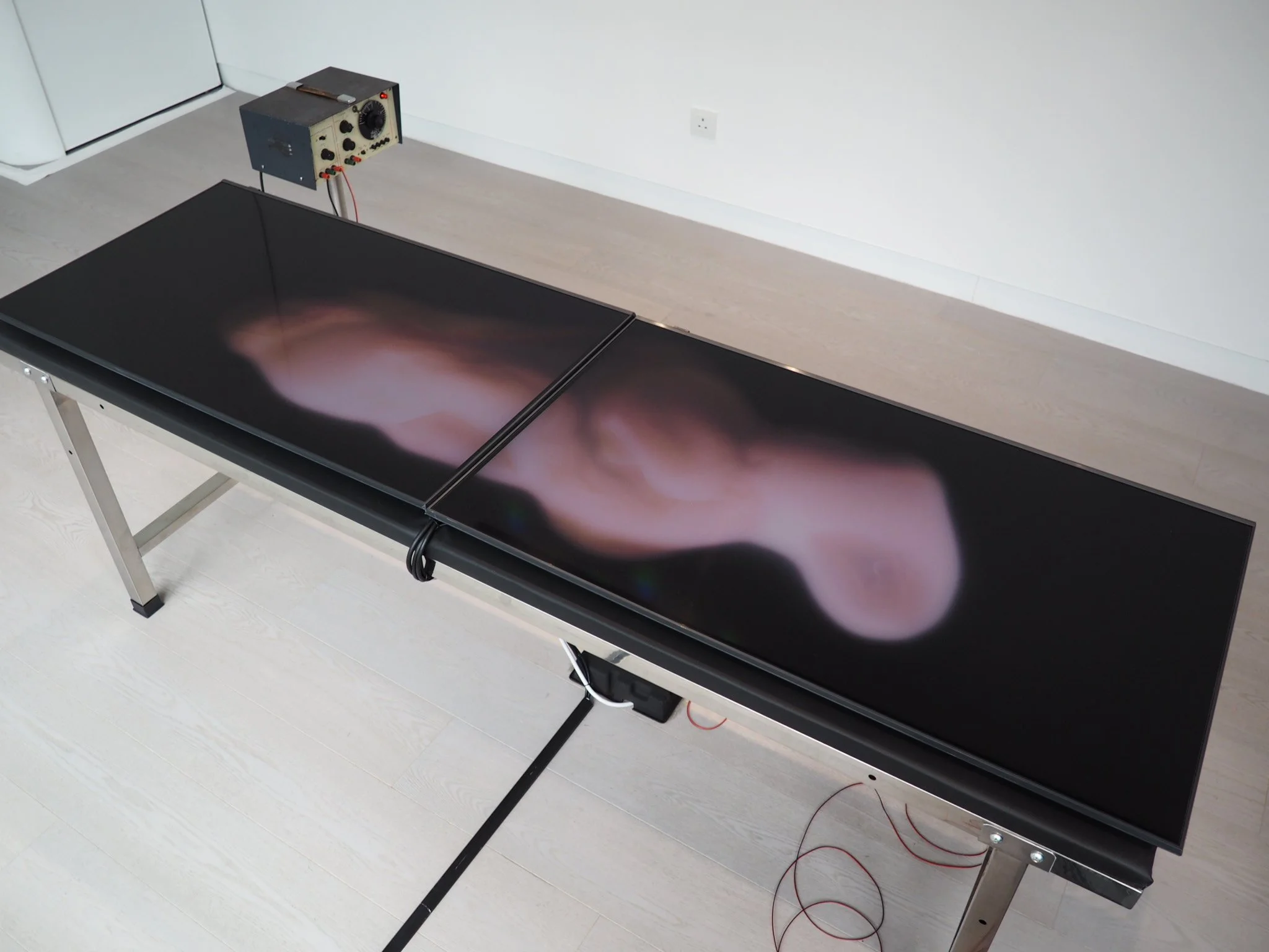 展覽的另一個房間,放了兩個屏幕及一個揚聲器,仔細地聽揚聲器是心跳聲。另外兩個屏幕就像是細胞分裂與結合,有一種重生的感覺。「你看得實在太準確,exactly就是外面有六個screens,用手腳去演奏成個piece。然後,最高籠頂有我的背面,其實我都slightly (少許)在動,指揮著六個人演奏的樂章。我們除了主要鏡頭之外,還有一個鏡頭在拍另一些角度,例如我指揮的手、其他手手腳腳的另一些位置,變成收集了很多影像,然後用CG 結合成一體,變成細房這個所謂『生物』。觀眾可以interpret,當作是新生物、怪物、異形,可以是生命的結束,或是生命的開始,其實完全是自己去詮釋。」